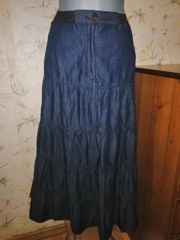 Этикетки с размером и составом ткани нет, смотрите замеры. Ткань "под джинс" , тонкая, не тянется. Цвет темный синий. Состояние очень хорошее. !!!! Есть дырочка возле пояса, можно аккуратно подшить, видно на последнем фото. Длина 82. П/о в поясе 46 тянется до 50. П/о бедер максимально 68. 25