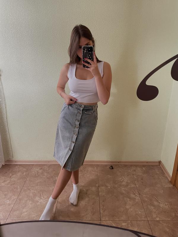 Дуже крута джинсова юбка,довжини міді,мій ріст 162,всі пуговки розтібуються