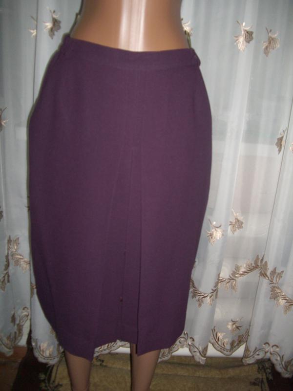 офісна спідниця бузкового кольору, на підкладі, попереду подвійні складки, всередині яких гудзички, з боків вгорі кишені, ззаду шліца, застібається ззаду на блискавку, пояс з боків на резинці, довжина за коліна. Заміри: ПОТ 37см, ПОБ 52см, довжина 65см.