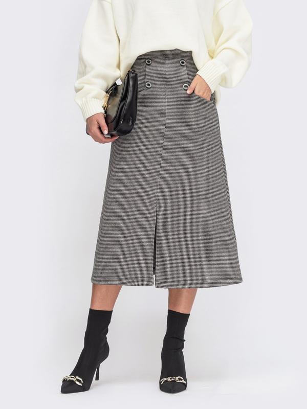 Спідниця довжини міді з жаккарда в гусячу лапку. Модель з кишенями, декоративними гудзиками та розрізом спереду. Пояс виробу доповнений шльовками. Застібається на потайну змійку. Колір:темно-сірий, коричневий, сірий довжина виробу – 77 см. Склад: 35% вовна, 35% віскоза, 30% поліестер Матеріал: Жаккард Розмір:44,46,48,50, 52 арт617525 Збір замовлення 1-3 дні!