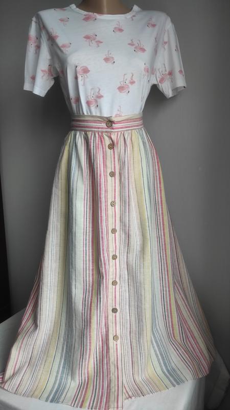 Стан ідеальний. Склад: 55% льон, 45% віскоза. Розмір вказано 12. Задня частина поясу на резинці. Заміри: НОТ - 40 см (тягнеться до 50 см); НОС - 71 см; довжина - 79 см. Додаткові фото та заміри надам за потреби. Дивіться інші мої оголошення.