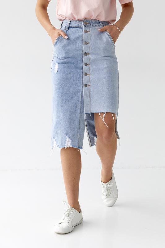 Жіноча двокольорова джинсова спідниця на гудзиках з асиметричним низом.
