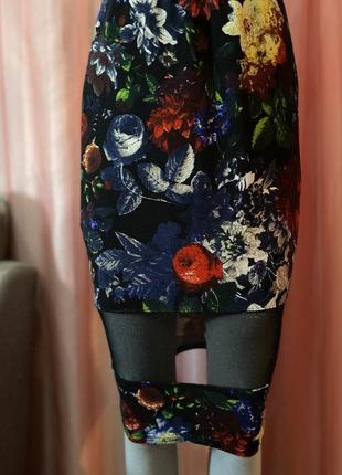 Чорна з принтом спідниця міді з сіткою знизу ошатна супер стрейч по фігурі олівець