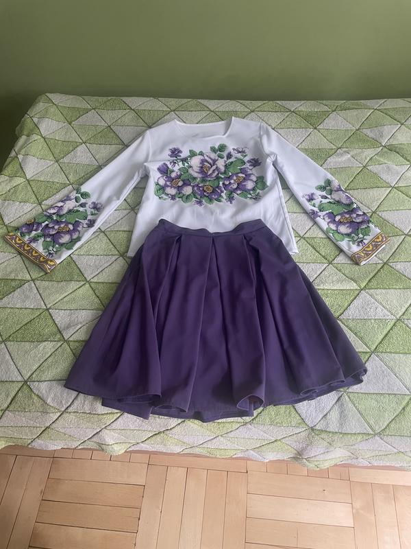 Вишиванка бісером, тканина габардин, ручна робота Рукави до низу розжирюються Довжина рукава сорочки: 56см Довжина сорочки: 55см Довжина спідниці: 53см Спідниця на талію 70-75, має замочок на бік, та підкладку (є на фото)