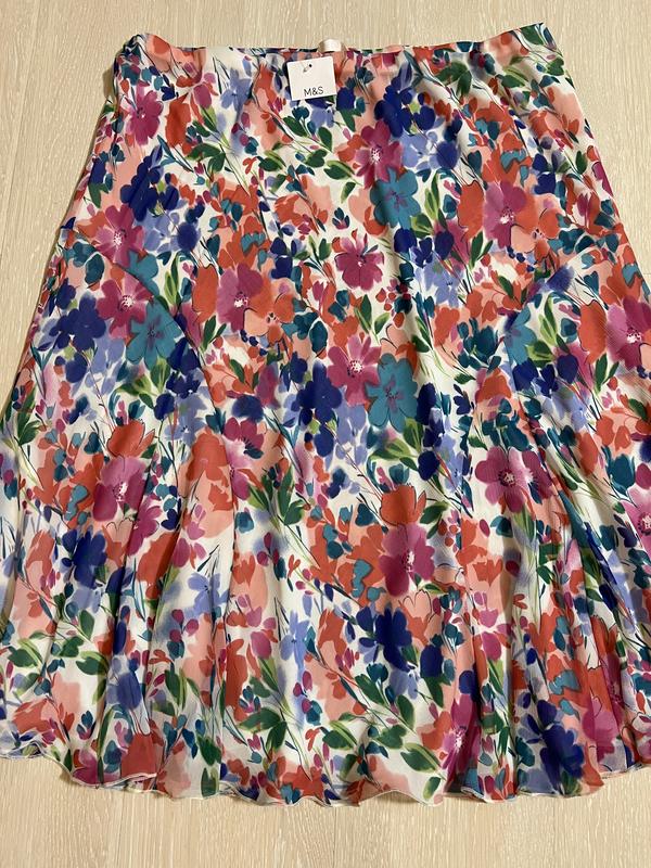 Пропоную до вашої уваги дуже красиву та стильну спідницю в кольорах (у живу має набагато цікавіший вигляд і колір насиченіший). Спідниця має підкладку. Фірма M&S. Розмір вказаний 20. Склад: 100% поліестер. Нова. Напівоб'єм у поясі (гумка) — 48...тягнеться до 65, напівоб'єм у стегнах — 70, довжина спідниці — 75. УВАГА!!! Під час купівлі три й більше своїх будь-яких речей — зісплатною доставкою посилки Новою поштою. Вдалих покупок.