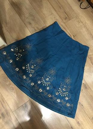 Короновая, размер м-л, с подкладкой, узор с пайетками, размер м-л, замеры дам, сзади потайной замок. Цвет морская волна, более до синего.