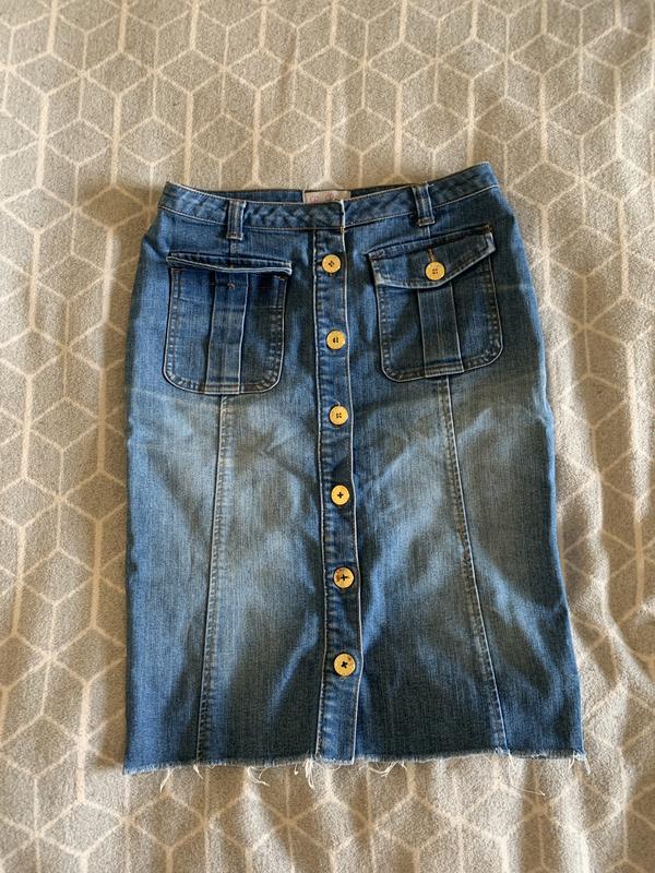 Джинсова спідниця з ґудзиками, в гарному стані, не вистачає одного ґудзика на кармані, можно зрізати і з другого карману і пришити якісь інші .