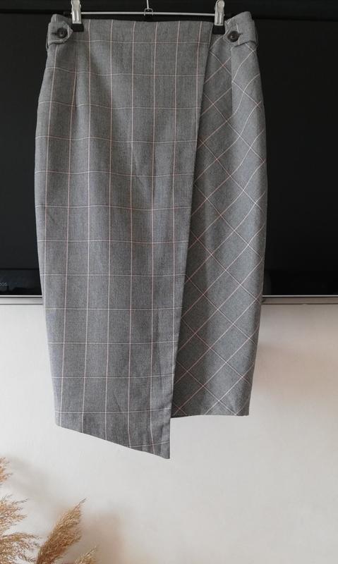 Дуже стильна на запах сукня. Світло сірого кольору в рожеву клітинку. Мае підклад. Склад якісний. В розмірі С не вилика М. Стан нової. довж-71см Пот-38см Пос-47см Середня посадка.
