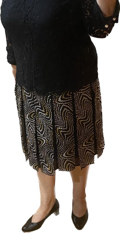 Спідниця в складку, які починаються від кокетки. Цікавий фасон: зовнішня складка має геометричний малюнок трьох кольорів ( чорний, білий, гірчичний). А внутрішня частина складки чорного кольору.. спідниця виконана з напівпрозорої тканини, підкладка не прозора. Складка відкривається в русі і створює романтичний образ. Тканина не мнеться і добре тримає складку. Талія 86 см. Довжина 70 см.