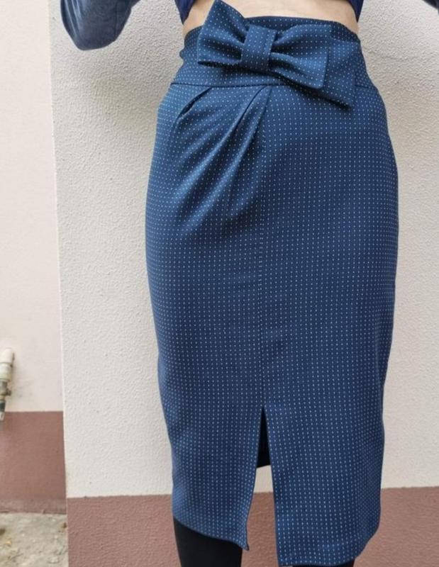 Синя спідниця в горошок, на прихованій блискавці збоку. пояс 34 см, довжина 70 см.