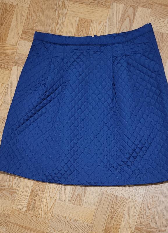 Тепла стьобана темно-синя спідниця. Довжина до коліна. Спереду 4, ззаду 2 складки. Довжина 49 см, піт 40 см, ширина знизу 62 см.