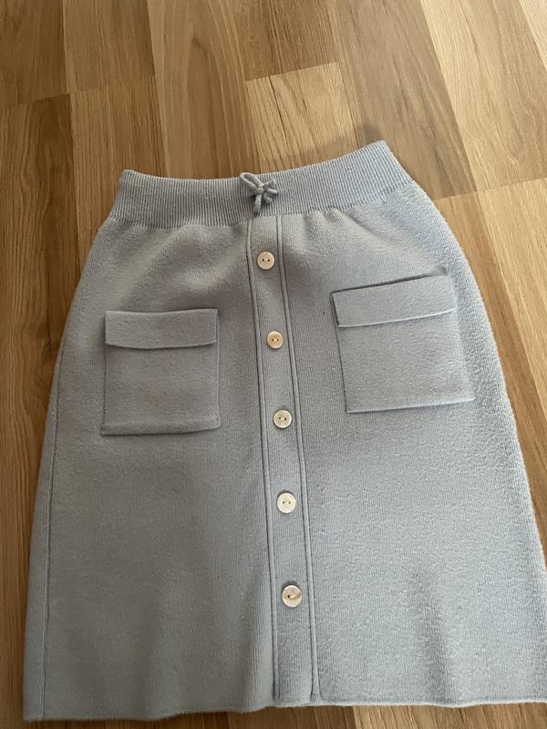 Блакитна, тепла спідниця розміру S-M має шнурочок на талії, щоб стягувати, кишені; довжина — 46 см, ширина — 41 см.