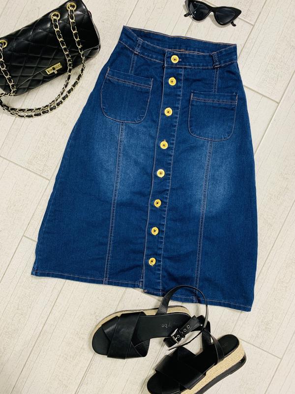 Розмір XS-S Заміри: В поясі ( в талії) 31 Бедра 50 Довжина 67 По низу 59,5 Повністю на гудзиках Мʼякий та приємний до тіла джинс Фасон: трапеція Завищена посадка Є кишені
