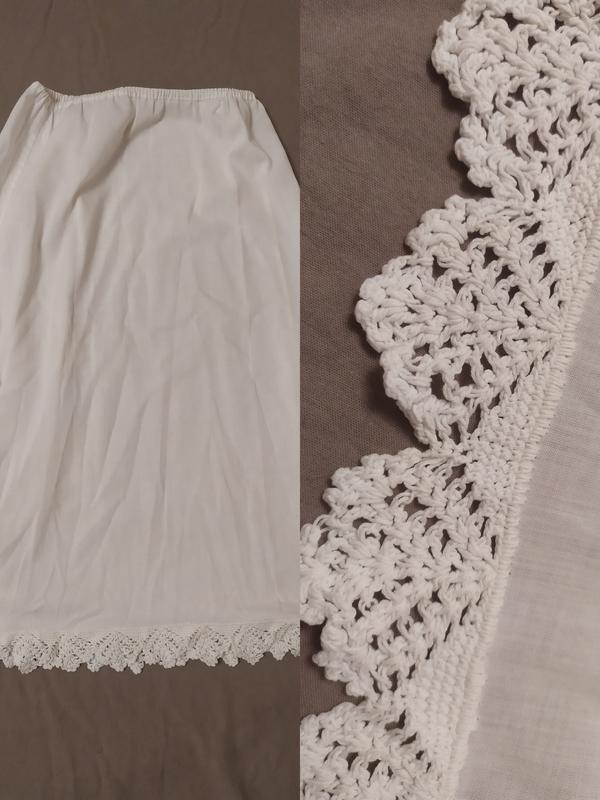 бавовняний вінтажний під'юбник із вплетеним мереживом знизу. мереживо саме вплетене в основу. повна довжина 71 см максимальний напівоб'єм 45 см мінімальний піт 32 см гумку можна замінити всередині