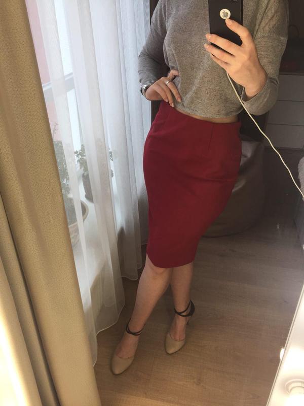 Яскрава спідниця футляр міді з виточками, кольору марсал