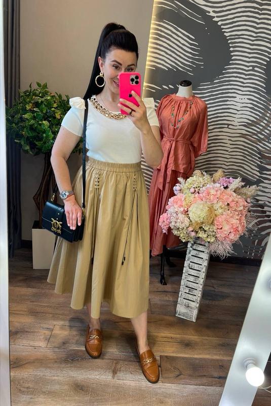 модная юбка сафари свободного кроя с удобными карманами по бокам на резинке вверху выполнена из плотного коттона, украшенного эффектной шнуровкой, она отлично сочетается с вещами и аксессуарами разных стилей и цветов размер единственный 42-46 длина 78 см, талия по изделию 34-35 см (не растягивая) код 0575 цена 1000грн