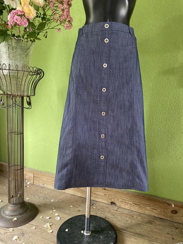 Отличная стильная качественная актуальная юбка миди от Peter Hahn. По талии по бокам вставки широкой резинки, застежка-молния по спинке, пуговицы -декор(не расстегиваются). Состав: хлопок/полиэстер/эластан(66/30/3). Бирка с размером срезанная. Замеры: длина-78 см, ПОТ-47 см, ПОБ-59см. Есть шлевки для ремня, два кармана. Юбка замечательная. Есть нюанс-молния была перешита-вручную. (Див. Последнее фото).