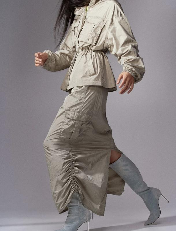 Довга спідниця-парашут із креп-нейлону з глибоким еластичним поясом, штучними ширинками та бічними кишенями-книжками. Прямий низ із високим розрізом та еластичними лаштунками зі стопорами з боків. Розслаблена посадка. Без підкладки.