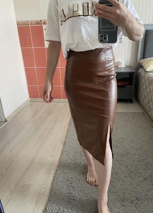 Спідниця міді коричневого кольору Шкіро замінник Еластична з маленьким розрізом з лівої сторони Висока посадка