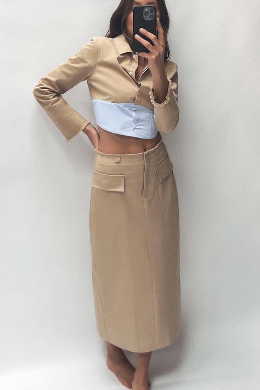 Спідниця з високою посадкою, акцентованими швами та непідшитими краями. Застібається на блискавку та гачок спереду. Клапани спереду та розріз ззаду внизу. Розмір - XS.