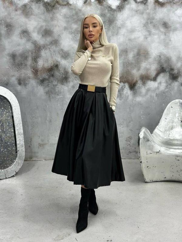 🌟НОВИНКА СЕЗОНУ 🌟 Спідниця з екошкіри зі складками Модель 3324 zig Розміри: 42-46, 48-52 Тканина: екошкіра на флісі Пояс не в комплекті! Шкіряна спідниця зі складками спереду, бічні кишені, шльовки. Пояс ззаду на блискавці та гумка для гарної посадки Шкіряна спідниця – тренд цього сезону. Легко поєднується з будь-яким верхом з вашого гардеробу, включаючи светри, блузки, топи та футболки. Завершити образ можна низькими чоботями з масивною підошвою, витонченими туфлями на підборах і навіть спортивними кросівками чи кедами. ⭐️⭐️⭐️⭐️⭐️⭐️⭐️⭐️⭐️⭐️⭐️⭐️