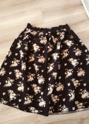 юбка миди, черный цвет, коричневыми цветами, поясная замочка