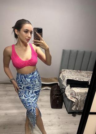 Довга спідниця з синьо-білими узорами , спереді посередині розріз Лягає по фігурі , тканина добре тягнеться Розмір С