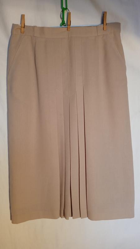 дуже гарна,нарядна,колір пудровий або світлий беж,тканина у складі вовна45%,поліестер55%,підкладка шовк,довжина по бічному шву80,пояс півобхват44,бедра57,є з боків кишені