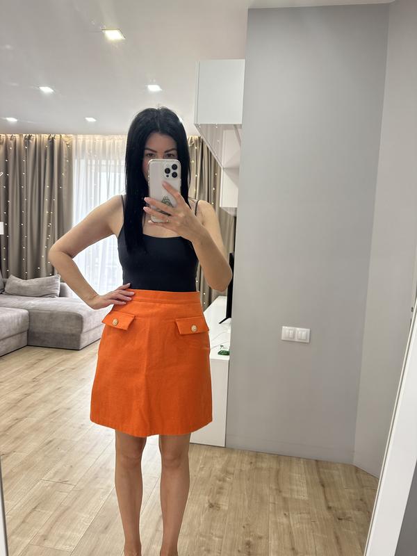 Помаранчева міні-спідниця з клапанами, декорована ґудзиками. Виготовляється з бавовни з поліестером. Фіксується за допомогою ґудзика та блискавки. Розмір: • L: довжина виробу – 49 см, ширина по талії – 39 см Матеріал : 50% вовна, 50% поліестер Стан новий , Не вгадала з розміром