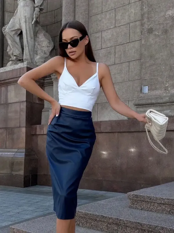 Темно-синя спідниця-олівець довжини міді з еко-шкіри в ідеально новому стані. розмір вказано uk8 S на фото при штучному світіл дає чорний колір але при натуральному на вулиці можна побачити темно-синій колір заміри довжина 64см. пів обхват по талії 34см. тягнеться +1-2см. пів обхват стегон 42см. тягнеться +1-2см. довжина розрізу ззаду 21см.