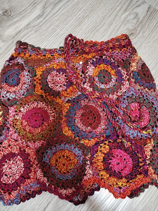 Ручна робота. Різнокольорова, літня. Розмір XS,S Талія -33 Стегна - 38 Довжина -32 Зав'язується паском, продітим у талії Без підкладки