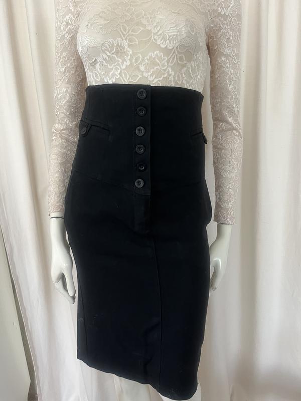 Чорна спідниця-олівець з високою талією чорного кольору.Цікава своїми численними деталями:застібка попереду на ґудзики та блискавку,6 карманів-4 попереду та два позаду,ремінець на талії позаду та невеликий розріз.Підкладка тільки на верхній частині-кокетці.Розмір 38(європ),стан дуже хороший.