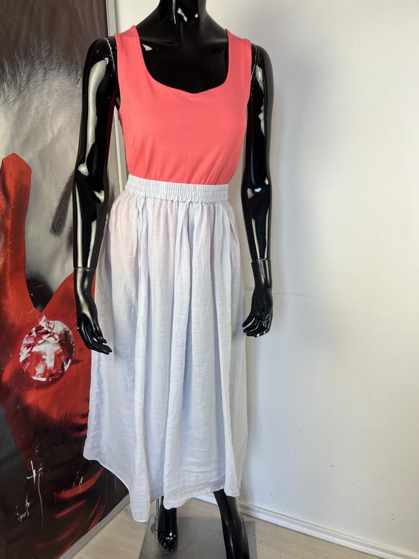 Талія на резинці-40, тягнеться до 54 На підкладці Бедра-72 Довжина-82 Легенька Колір сіро-блакитний