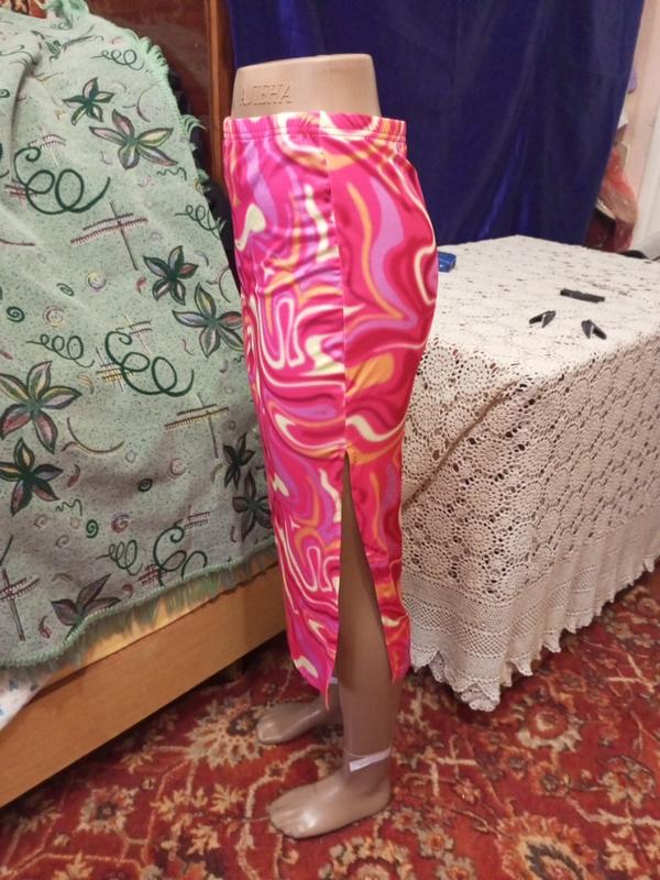 дуже гарна спідниця на високій посадці з розрізом на ніжці. Тканина єластична, добре тягнеться. Розмір с, м. опис стан отлічний довжина 74 пояс і пот 33 ширина бедер 43