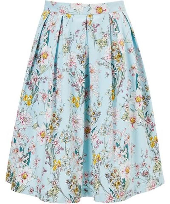 Шикарна ніжно-блакитна спідниця у квітковий принт. Застібається на ґудзик і замочок. Посадка висока. Спідниця доволі обʼємна, але не надто - має підкладку і додатковий шар фатину, як показано на фото. Нова, без дефектів.