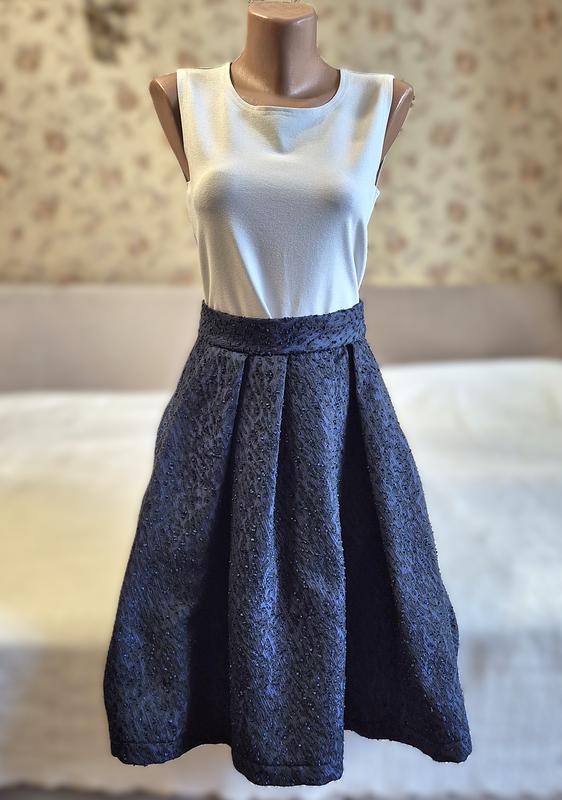 H M Розкльошена спідниця з кишенями з тканини букле розкльошена спідниця з тканини "букле" розкльошений силует блискавка с заду кишені збоку довжина міді колір темно синій склад поліестер вказано розмір 36 підійде на xs s Орієнтир за вимірами! виміри порівнюємо із вимірами свого одягу виміри в напівобхваті см\ талія піт 34 см стегна поб 81 ширина знизу 109 довжина по зовнішньому краю 62 63 довжина по середині 60