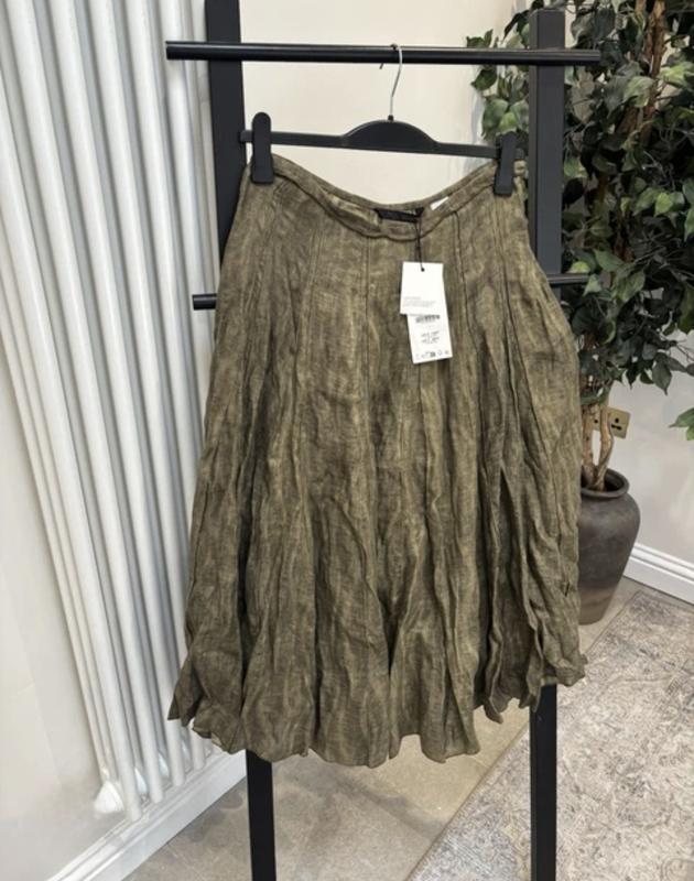 Розкльошена спідниця середньої довжини зі 100%-го штапельного льону. Застібається на приховану блискавку. Кльош унизу.