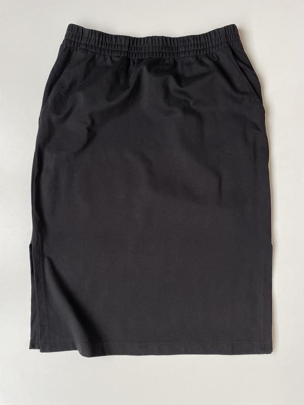 Чорна спідниця міді arketу спортивному стилі Розмір М, підійде на L У поясі резинка Кишені і розрізи з боків ПОТ - 40 - 50 см ПОС - 55 см Довжина - 73 см