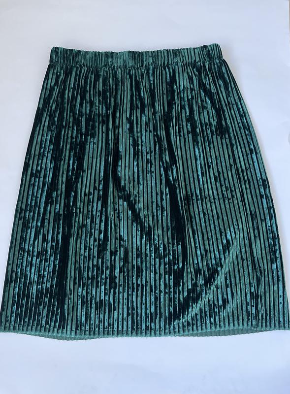 Без дефектів Заміри: Півобхват талії - 34,5 см (резинка, тягнеться) Довжина - 56,5 см Дуже гарний смарагдовий колір, хороша якість Спідниця міді