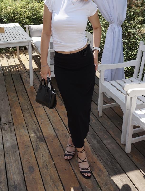 Довга стрейч спідниця в рубчик, чорного кольору на резинці, розріз середній позаду