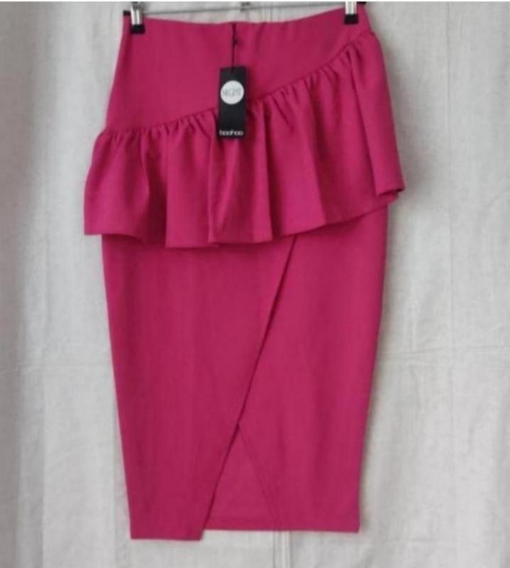 Шикарна стрейчова спідниця кольору рожевої фуксії; з баскою спереду по діагоналі; низ звужений " на запах " . пояс на резинці; відомого британського бренду Boohoo Виміри: довжина – 74; напівобхват стегон -від 47; обхват пояса від 71 до 88 при розтяжці резинки. Розмір uk-12(46).