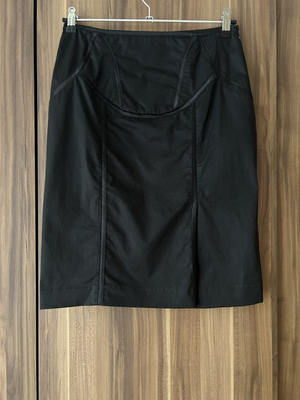 Класична чорна спідниця-олівець. Базовий фасон з цікавими конструктивними деталями, підійде і під класичний і під спортивний стиль. Стан дуже добрий, єдиний нюанс (останнє фото) вічна хвороба всіх спідниць з розрізом на нозі, але це все сховається під шов, легко зробити в ательє. Розмір 42