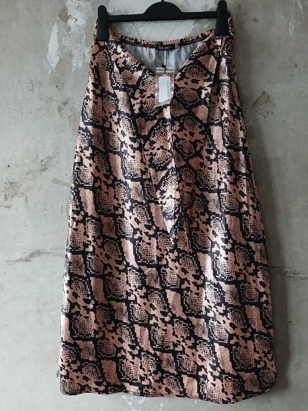 Жіноча міді-спідниця з принтом "зміїна шкіра" від boohoo Трендова та сексуальна атласна міді-спідниця з акцентом на талії від популярного британського бренду boohoo. Ідеальний вибір для вечірніх виходів, вечірок чи стильних повсякденних образів. Принт "snake print" у ніжному персиково-бежевому відтінку з чорним — виглядає дорого та ефектно, додає нотку дикості та гламуру. Особливості дизайну: Довжина міді (нижче коліна), А-силует — витончено облягає стегна та розширюється донизу. Фірмовий декоративний вузол спереду (knot front) — створює красиву драпіровку та підкреслює талію. Гладка сатинова тканина з легким блиском — переливається на світлі, виглядає розкішно. Еластичний пояс для комфортної посадки. Новий стан з оригінальними бірками (new with tags). Розмір: UK 12 (EUR 40 / FR 40 / DE 38 / US 8 / AUS 12 / NZ 12) відповідає українському приблизно 46-48 (M-L). Заміри: Талія напівобхват- 35см Талія ,у максимально розтягнутому стані, напівобхват- 48см Стегна напівобхват-46см Довжина-83 см Склад: 100% поліестер — легка, приємна до тіла тканина, не мнеться, добре тримає форму. Догляд: Машинне прання з подібними кольорами, прасувати з вивороту Ця спідниця — must-have для тих, хто любить animal print! Чудово поєднується з чорним топом, боді, блузкою чи джемпером. Додає образу жіночності, елегантності та легкої провокації. Ідеально для осені, зими чи весни,і літа теж