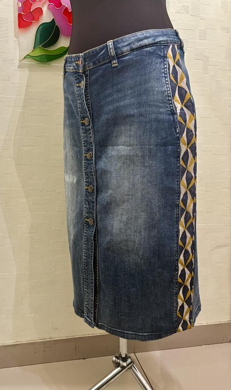 Крутезна джинсова (стрейч) спідниця - олівець в ідеальному (новому) стані , по боках з лампасами - що візуально струнить фігуру мінімум на 2 розміри , класичний темний колір джинсу. На останньому фото вказана форма спідниці на людині . Вказано 38-й розмір але підійде від 48-го до 54-го українського вільно.