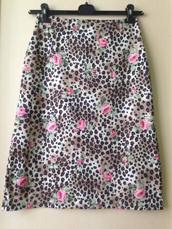 Ефектна трикотажна спідниця, добре тягнеться. Тканина- 100% ПЕ. Розмір вказаний М. НОТ 36+см, НОБ 51 см, довжина 65,5 см.