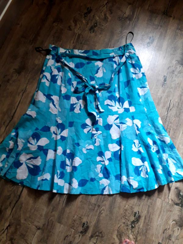 Яскрава стильна спідниця з підкладкою💎 натуральна тканина, відмінної якості. Льон + віскоза. Виробництво Шрі ланка Розмір 18. Піт 48 + тягнеться резиночки 53. Побіди 66. Довжина-75.