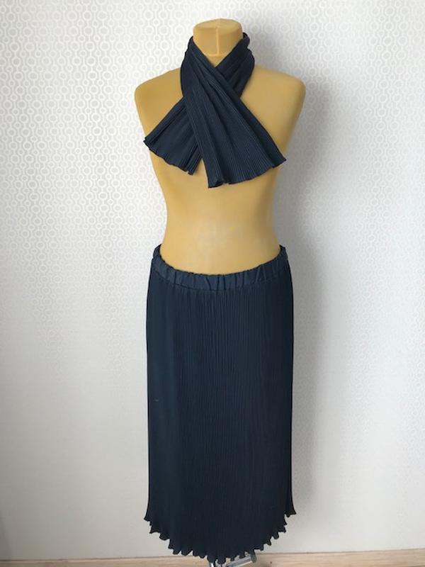 Классная стильная юбка. Приятный цвет иссине-черный (цвет вороньего крыла) Пояс - резинка. В комплекте шарфик из той же ткани - можно поиграться с образами ) Размер достаточно универсальный - показала посадку на манекены разных размеров (параметры манекенов ниже в объявлении) Замеры в не растянутом виде, см: ПОТ (по поясу) 43, тянется до55 ПОБ 58, тянется до 65, если больше - может начать сглаживаться гофре, длина 78. длина шарфика 87. Объёмы желтого манекена, см : плечи 40, ОГ 97, ОТ 77, ОБ 100 Объёмы черного манекена, см: плечи 43, ОГ 108, ОТ 90, ОБ 114