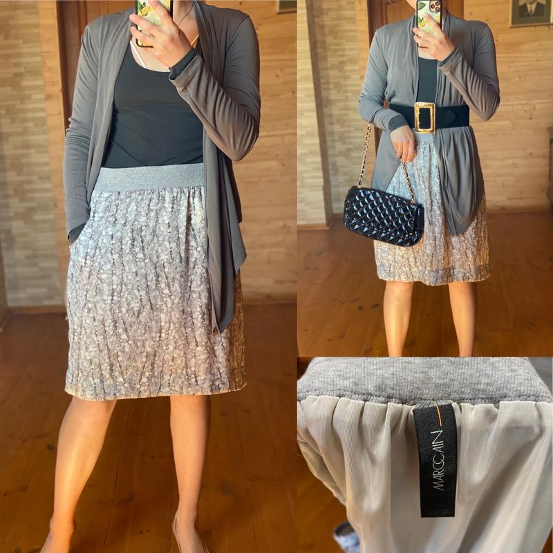Спідниця 4 розмір (є зачіпки )за принта не видно .Кофта 2.маленькі внутрішньо зачіпки .кофта /кардиган 3 в складі є шовк .Треба прати