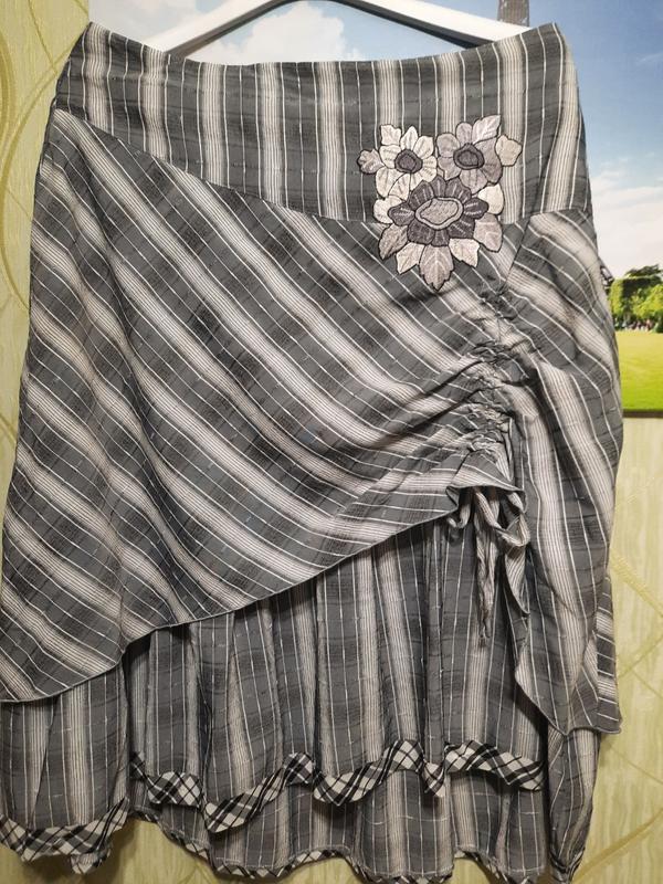 Спідниця з декором, як подвійна( обманка),верхня частина збирається тісною.ПІТ - 44, довжина спереду-70, ззаду-80.