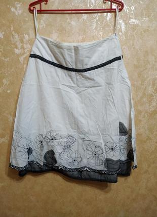 Лёгкая двухслойная юбка, выполненная из тонкого хлопка. Верхняя юбка украшена вышивкой-цветами и элементами из черного фатина. На нижней юбке край отделан черным фатином и прошлой. Застёжка сбоку - потайная молния